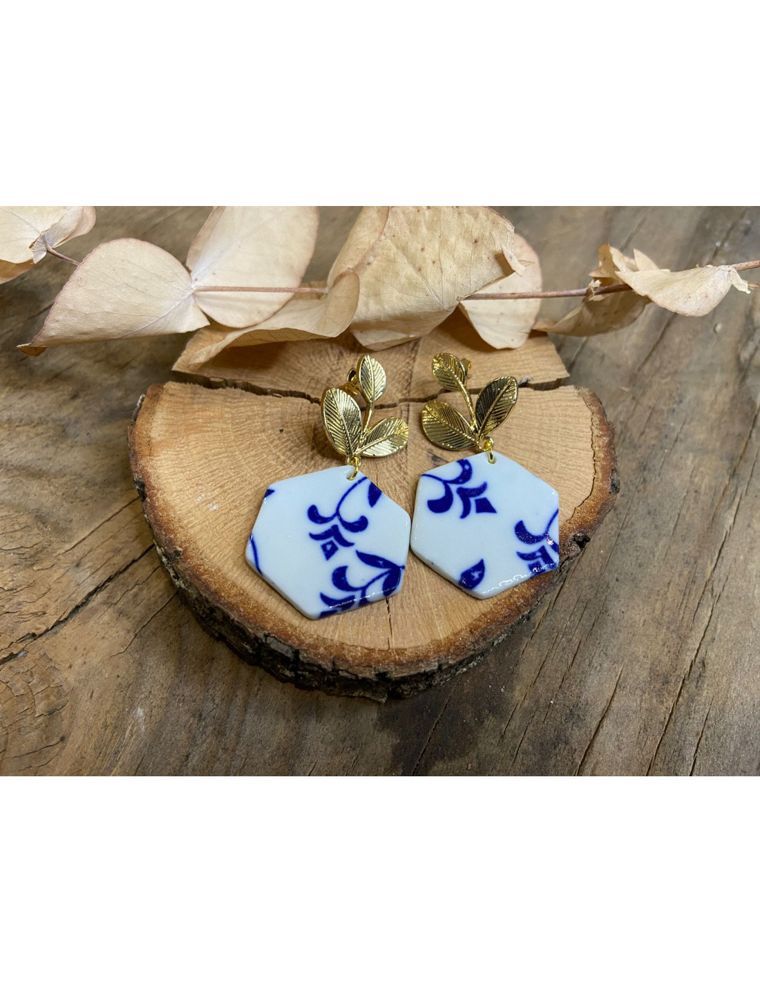 Pendientes con estampado floral en cobalto y acabado en esmalte transparente de alta temperatura enganchado en hojas de aleación de Zinc chapado en oro.