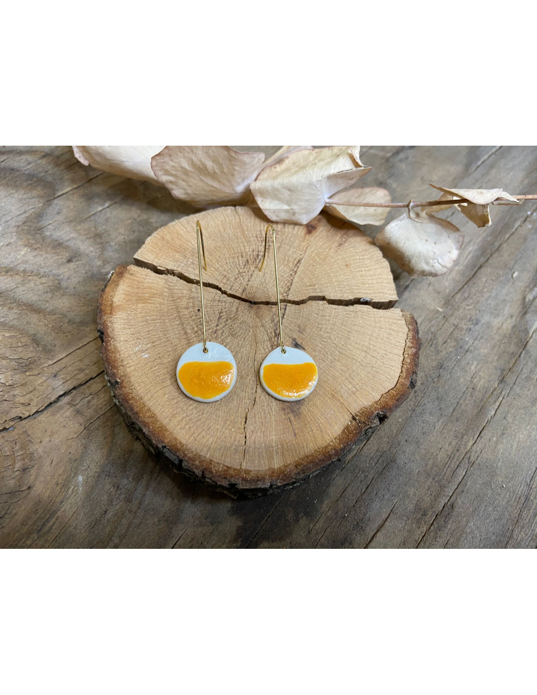Pendientes redondos de porcelana esmaltado en naranja con enganche largo de acero inoxidable chapado en oro.