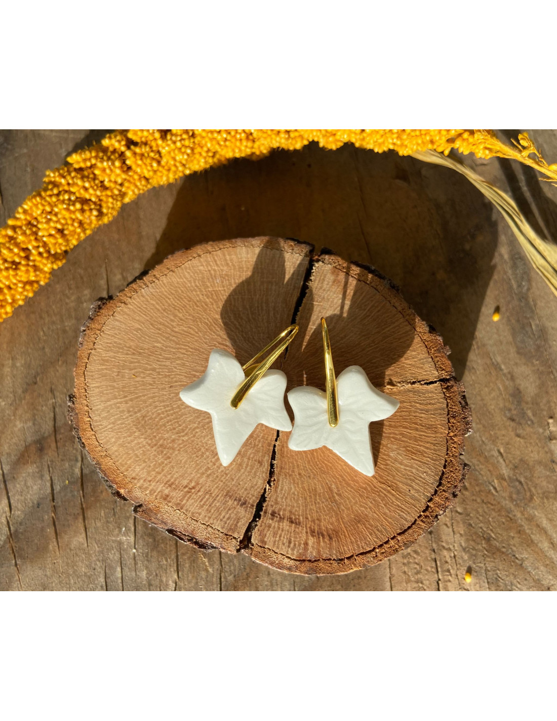 Pendientes de cobre chapado en oro de 18k con porcelana en forma de hiedra esmaltado con esmalte transparente.