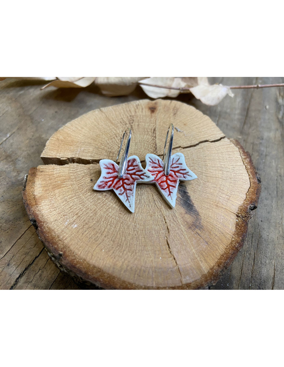 Pendientes de cobre chapado en plata con colgante en forma de hiedra esmaltado en rojo de baja temperatura llevado a alta.