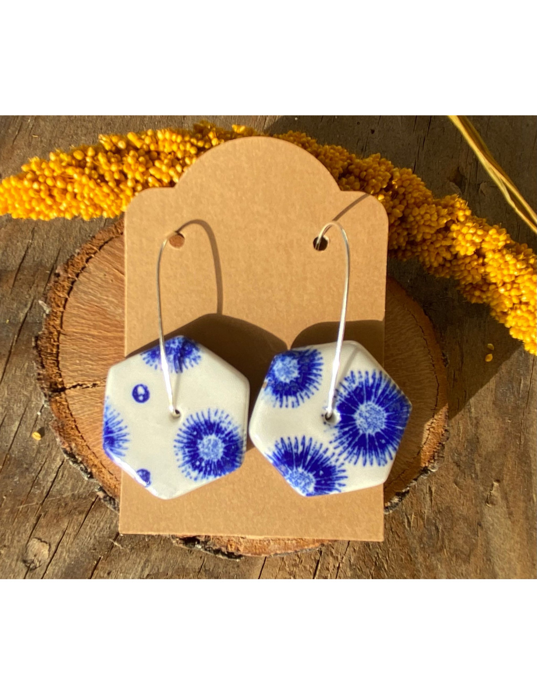 Pendientes en acero inoxidable chapado en plata con hexágono en porcelana decorado en azul cobalto y esmaltado en transparente.